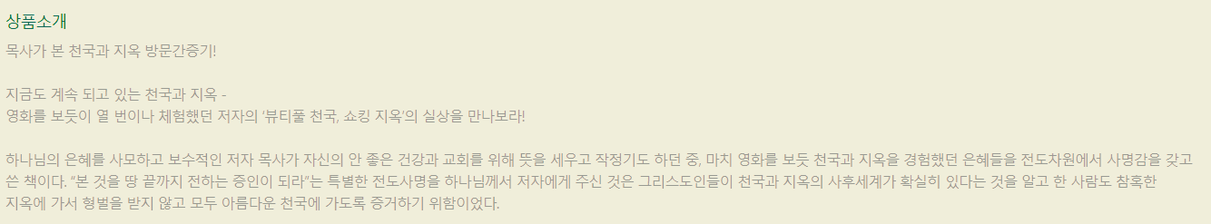 천국에 이승만 대통령 계셨고 ...... 다른 대통령은 못봤다는 내용과........우리가 아는 자살한 연예인들,,,,,지옥에 가 있는 것도 보았고, 많은 믿는 사람들 또한 제대로 예수님을 믿지 못했기에 지옥에 간것을 보여주고 있다. 이것을 보여 주신 목적은 한 영혼이라고 구원시키려는 하느님의 자비와 사랑인 것입니다. 대형교회와, , 많은 목사들이 가르치지 않는 지옥 ..... 또한 성도나, 신자들도 축복받는 것만 추구하고.....천국과 지옥을 생각하지 않고 준비하지도 못하게 한다. .. 또한, 저자의 간암 초기 치료와 같은 기적적인 경험은 하나님의 능력과 자비를 강조하며, 독자들에게 큰 감동을 줍니다