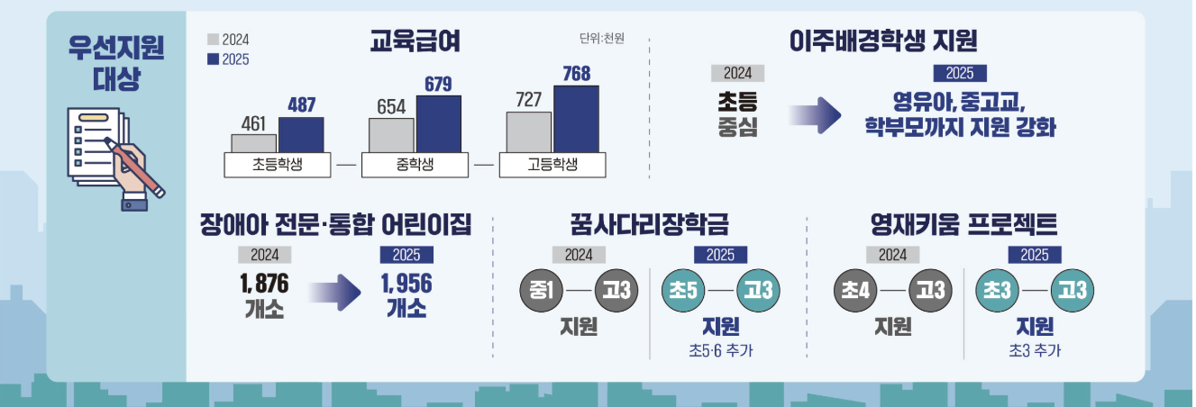 교육지원금은 기준중위소득 100% 이하 가구의 학생을 주 대상으로 지원합니다. 기초생활수급자, 차상위계층, 한부모가정, 다자녀 가정 등은 우선지원 대상으로 분류되며, 특수교육 대상자 및 취약계층 아동·청소년도 포함됩니다. 대학생 및 성인학습자를 대상으로 하는 교육지원금은 별도의 장학금·학습바우처 사업으로 운영됩니다.