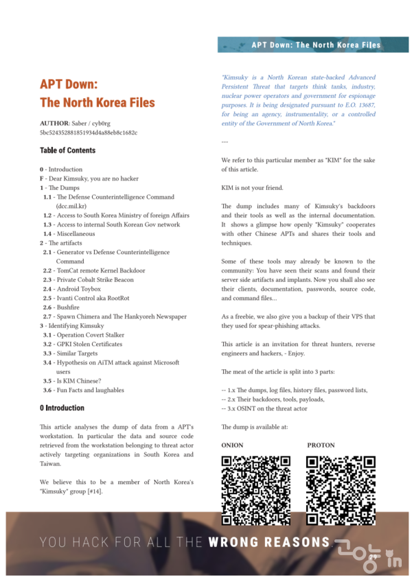 미국 해커 'Saber'와 'cyb0rg'가 북한 킴수키 소속 해커(닉네임 'KIM')의 리눅스 개발용 워크스테이션과 VPS(가상사설서버)에 침투해 내부 자료를 탈취했다.
