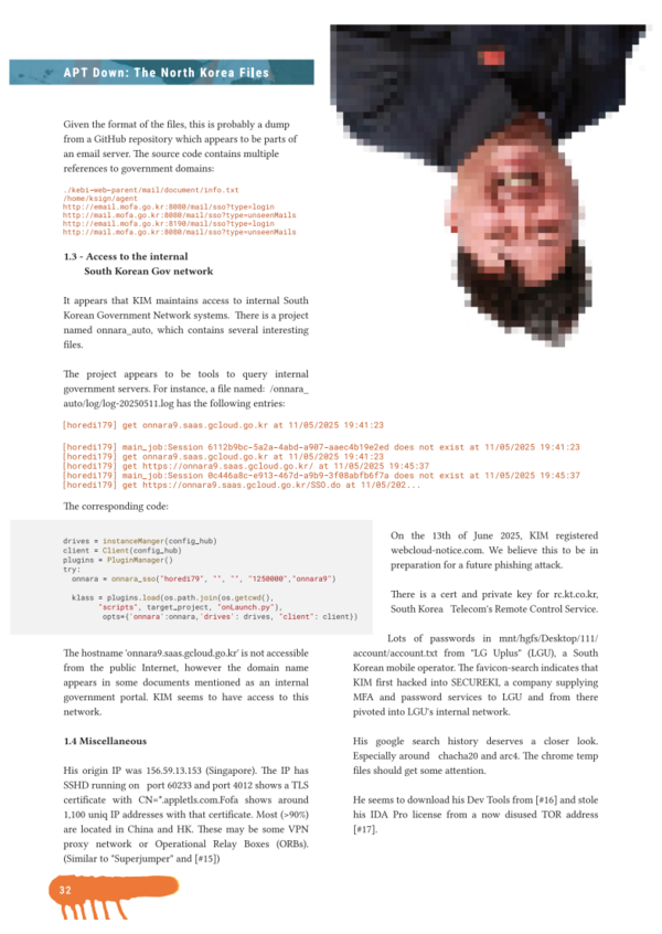 - 암호화폐 해킹 및 자금세탁 관련 자료자료의 한계: 이번 유출은 킴수키 조직 전체가 아닌 개별 해커 1명의 작업 환경에서 나온 것으로, 북한 사이버 공작의 일부만을 보여준다.