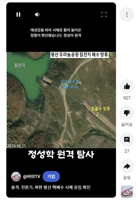 영변 원자로에서 방출되는 냉각수, 원자로 가동 증거황해북도 평산 우라늄이 예성강 거쳐 서해 강화도나 한강으로 방출. |