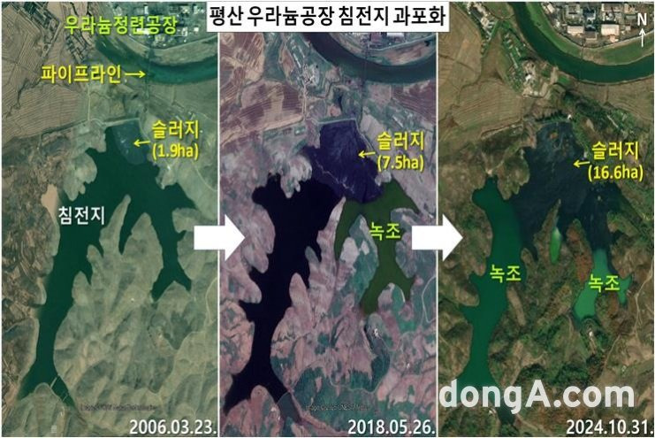 원격탐사 전문가 정성학 박사(한국우주보안학회)는 미국 환경체계연구소(ESRI)의 ‘월드뷰-3’ 위성사진을 분석해 북한 평산 우라늄 정련공장의 침전지에서 외부로 이어지는 배수로와 침출수 흐름을 확인했다.