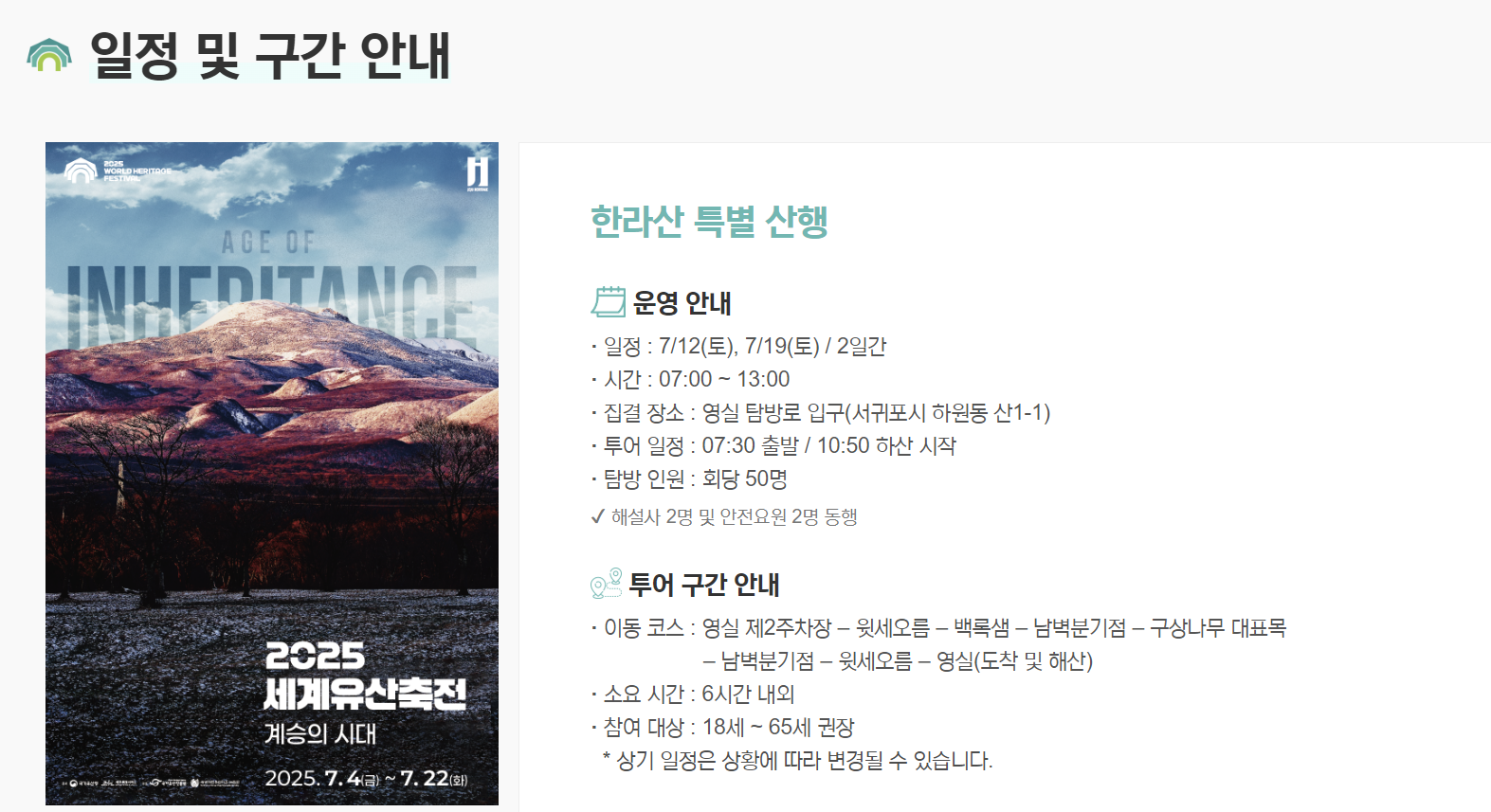 기상악화 시 일정이 취소되거나 변경될 수 있으므로 홈페이지 공지사항을 꼭 확인해야 합니다.