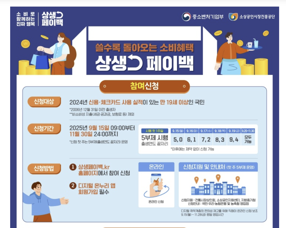 상생페이백 신청은 2025년 9월 15일 오전 9시부터 11월 30일 자정까지 가능합니다. 단 한 번만 신청하면 이후 자동으로 집계되므로 매우 간단합니다. 다만 마감일 이후에는 환급과 소비복권 응모 기회를 잃게 되니 반드시 기간 내 신청해야 합니다. 현장 신청은 전통시장 상인회·소상공인 지원센터에서 11월 28일까지 접수 가능합니다.
